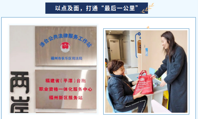 以点及面,打通“最后一公里”长乐区司法局前移服务窗口,于2024年7月在两岸融合社区挂牌设立涉台公共法律服务工作站,延伸法律服务半径,精准对接台胞台企服务需求。依托涉台公共法律服务工作站,联合区委台办、区检察院等部门开展“法润两岸·非遗连心——姐妹同心共筑家园”主题活动,进一步增进两岸情谊。同时,充分发挥12348热线、乡镇(街道)公共法律服务工作站平台作用,形成多层级、全覆盖的公共法律服务网络,助力打造台胞台企登陆“第一家园”。今年以来,公共法律服务平台解答涉台法律咨询50余人次。