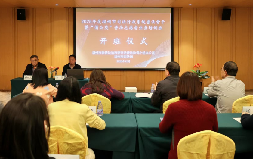 为进一步提升新时代全市普法依法治理工作水平和司法行政系统普法宣传队伍素质,推动“蒲公英”普法志愿服务创新发展,2025年12月10日至12日,中共福州市委全面依法治市委员会守法普法协调小组办公室、市司法局在闽侯县举办全市司法行政系统普法骨干暨“蒲公英”普法志愿者业务培训班。市司法局党组成员、政治部主任林波参加开班仪式并作动员讲话。市直部门、县(市)区司法局的相关负责人、业务骨干50余人参加了培训。