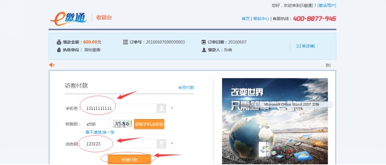 (1)访客付款方式:报名人员第一次使用本手机号码在E缴通公共缴费平台缴费时,只需通过平台中的[访客付款]界面,输入手机号码、动态码即可直接跳转至相关银行网银支付系统进行缴费。如图所示: