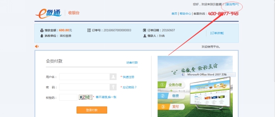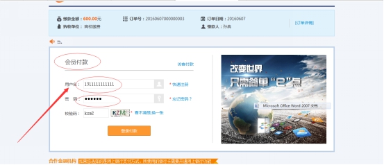 (3)会员付款方式:报名人员完成[激活用户]操作程序后,再次缴费时即无需通过手机验证,只要直接点击[会员付款],输入相应的用户名(手机号/邮箱)、密码和校验码即可直接进行付款。如图所示: