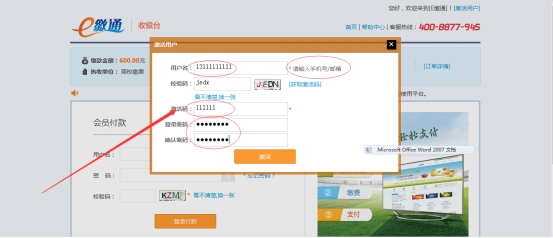 (2)会员激活缴费方式:若报名人员第二次在E缴通公共缴费平台缴费时,用该平台已验证并留存一次缴费记录的手机号码缴费,则需先通过[激活用户]程序将该用户进行激活,即点击[激活用户],在弹出窗口中输入手机号码/邮箱、激活码和设置会员登录密码,再点击[激活]即可完成[激活用户]操作程序。如图所示: