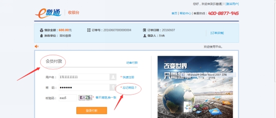 (4)如果会员忘记以前设置的密码,可以通过平台[会员付款]中的[忘记密码]进行找回,即点击[忘记密码],平台将直接跳转至密码找回界面,按提示依次进行操作,即可完成密码的修改。如图所示: